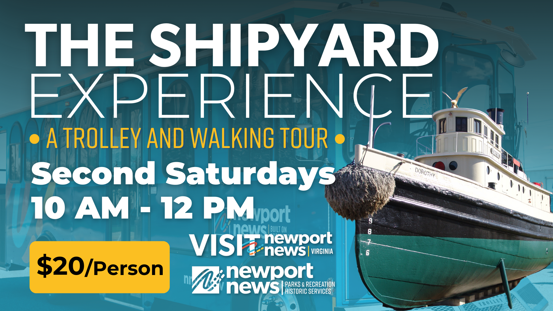 Explore the history of Newport News Shipyard on a guided trolley tour led by a museum historian from Newport News Historic Services. While the shipyard itself is not accessible due to security restrictions, the tour visits key related sites including Huntington Avenue, the tugboat Dorothy, the Apprentice School Dormitory, Victory Arch and Victory Landing Park, the Yard District, and Hilton Village. Guests will learn about the shipyard’s founding, its role in 20th-century wars, and its impact today.